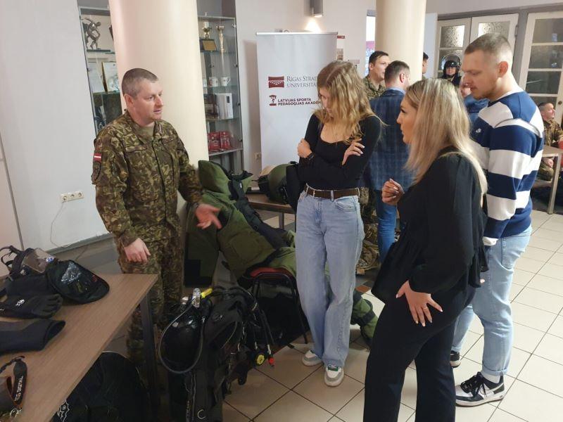 On 13 November, representatives of the Latvian National Armed Forces Military Police visited the Rīga Stradiņs University (RSU) Latvian Academy of Sport Education (LASE) as part of events during the week of Latvian Independence Day. During the visit, students and staff were provided with valuable information about military service in the National Armed Forces, including opportunities to study various military specialities and pursue military education. The Military Police also showcased their equipment and machinery, offering the participants a unique opportunity to view these assets firsthand.