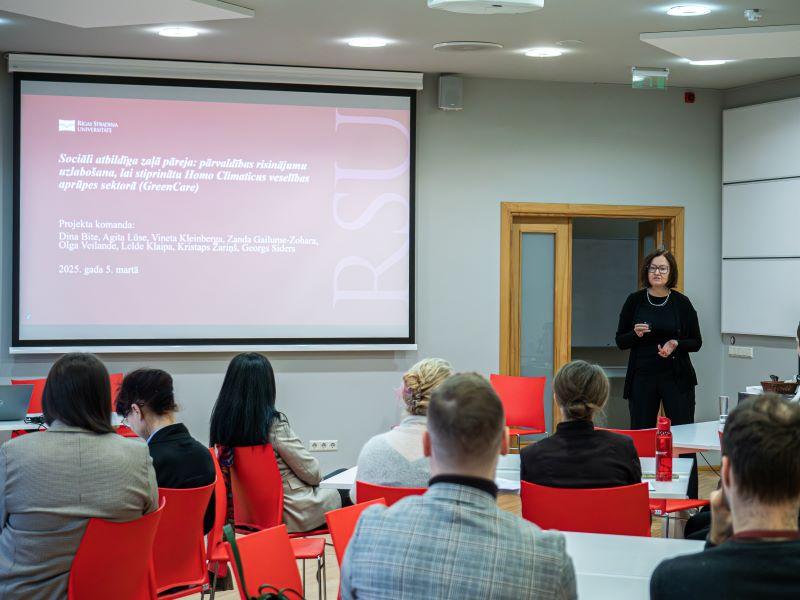 Rīgas Stradiņa universitātes (RSU) Zinātnieku brokastis 5. martā bija veltītas tematam par atbildīgu pieeju resursiem un zaļo domāšanu veselības aprūpē, pulcējot 35 dalībniekus klātienē un attālināti. RSU zinātņu prorektore Agrita Kiopa ievadā uzsvēra sabiedrības norišu izpētes nozīmību un deva vārdu RSU vadošajai pētniecei, asoc. prof. Dinai Bitei – pētījuma Sociāli atbildīga zaļā pāreja: pārvaldības risinājumu uzlabošana veselības aprūpes sektorā (GreenCare) vadītājai. Projektu īsteno starpdisciplināra septiņu RSU pētnieku komanda.