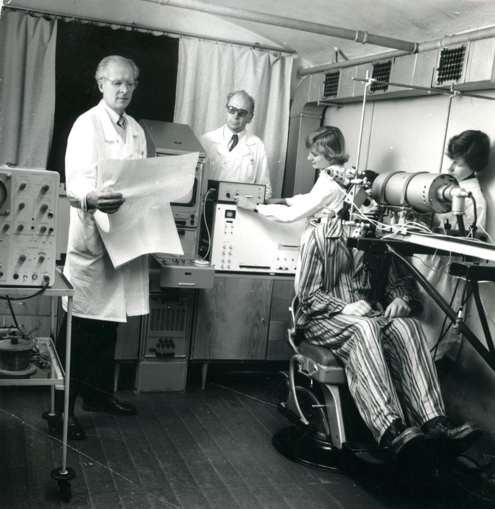 RMI Terapijas katedras docents Agnis Štifts (no kreisās) un ārsts Jānis Popēns ar kolēģēm Endokrinoloģijas centra hormonu laboratorijā XX gs. 70. gados. Foto: Paulis Cīrulis
