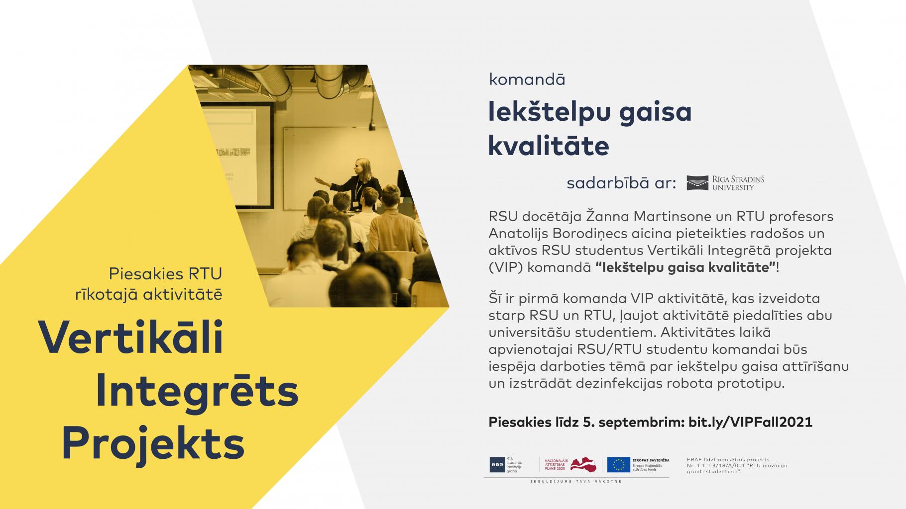 RSU vertikāli integrētā projekta (VIP) studiju kursa Iekštelpu gaisa kvalitāte docētāja Žanna Martinsone aicina pieteikties radošus un aktīvus RSU studējošos, lai īstenotu pirmo sadarbības kursu ar Rīgas Tehnisko universitāti par iekštelpu gaisa attīrīšanas un dezinfekcijas robota prototipa izstrādi.