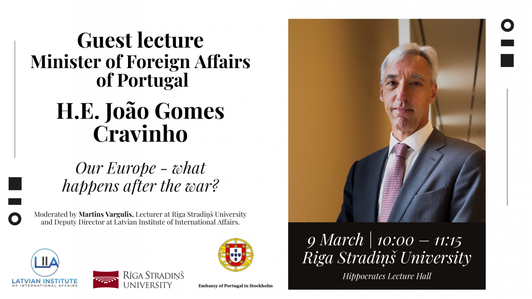 Ar studentiem, mācībspēkiem un citiem interesentiem mērķētu vieslekciju Our Europe – what happens after the war? (Mūsu Eiropa – kas notiks pēc kara?) Rīgas Stradiņa universitātē (RSU) 9. martā plkst. 10 Hipokrāta auditorijā (Dzirciema ielā 16) viesosies Portugāles Republikas ārlietu ministrs Žuāu Gomešs Kravīņu (João Gomes Cravinho).