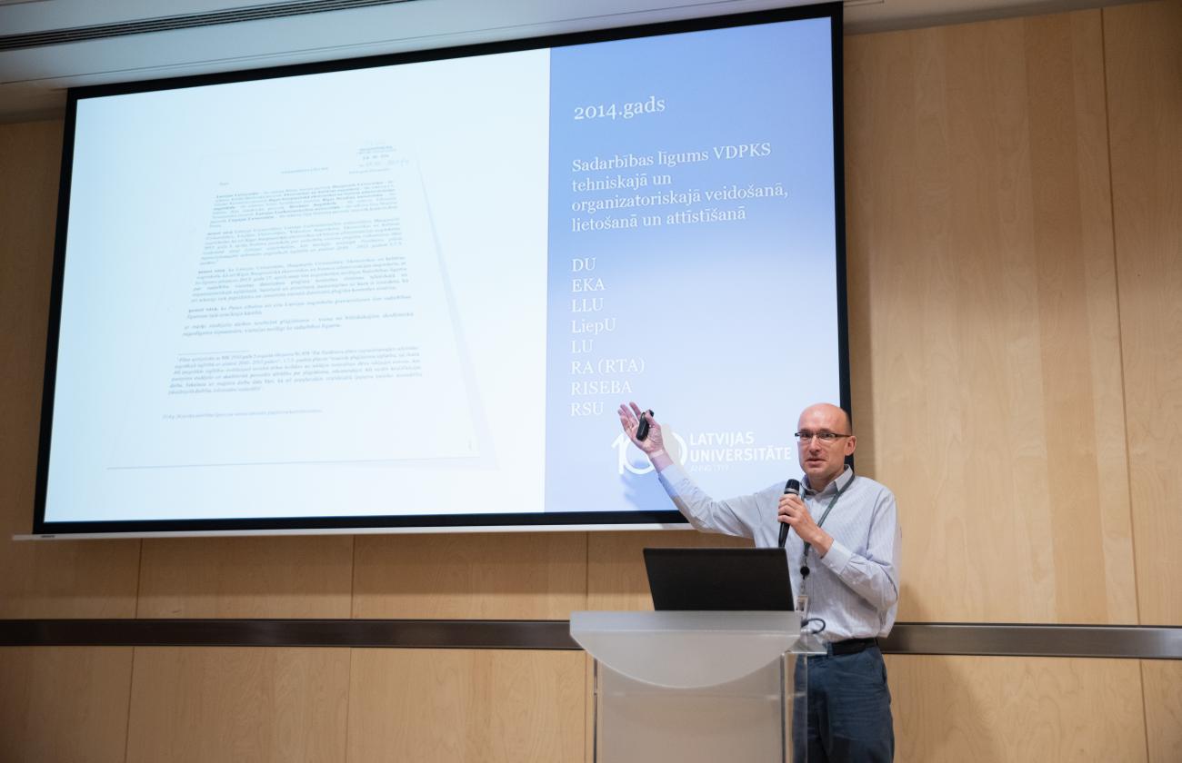 LU vienotās datorizētās plaģiāta kontroles sistēmas veidotājs Jānis Kreicbergs prezentēja LU veiksmes stāstu, kur, sākot no 2014. gada, kad tika noslēgta pirmā vienošanās starp astoņām augstskolām, sadarbībā iesaistīto augstskolu skaits ir palielinājies līdz 21 augstskolai, kā arī aicināja vēl citas augstskolas un koledžas pievienoties.