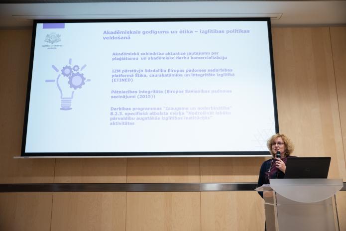 Prezentāciju sadaļu turpināja IZM Struktūrfondu departamenta direktora vietniece augstākās izglītības un zinātnes attīstības jomā Ilze Sīle un IZM Augstākās izglītības, zinātnes un inovāciju departamenta vecākā eksperte Inta Jaunzeme ar kopīgu pārskatu par ministrijas iniciatīvām un atbalstu, tai skaitā Eiropas Sociālā fonda atbalstu akadēmiskā godīguma veicināšanai Latvijā, prezentācijā norādot, ka ir būtiski veicināt izpratni par akadēmisko godīgumu un tā nozīmi kā mācībspēku, tā arī studējošo vidū un ka akadēmiskais godīgums ir ne tikai attiecināms uz augstākās izglītības sektoru, bet arī uzskatāms par sabiedrības drošības jautājumu.