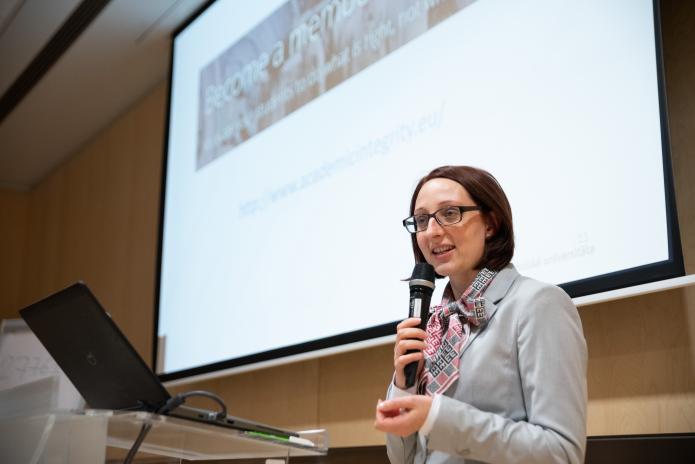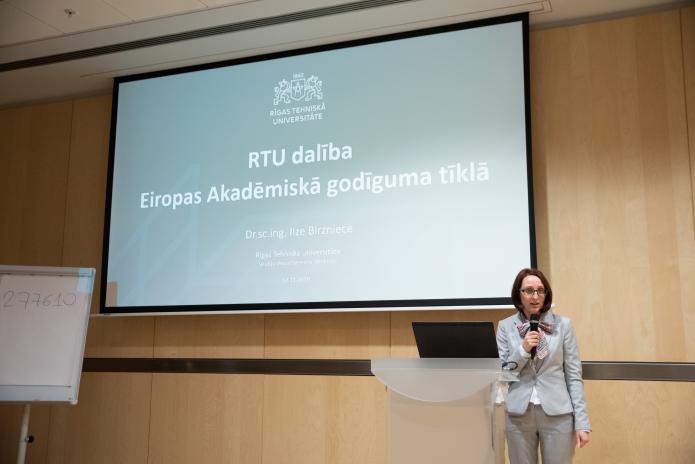 RTU Studiju departamenta direktore Ilze Birzniece prezentēja RTU iesaisti ERASMUS+ projektā, kur sadarbībā ar vairākām citām Eiropas augstskolām tika nodibināts Eiropas līmeņa akadēmiskā godīguma tīkls, izstrādāti dažādi informatīvi materiāli, tostarp skaidrojošs terminu glosārijs un akadēmiskā godīguma vadlīnijas.