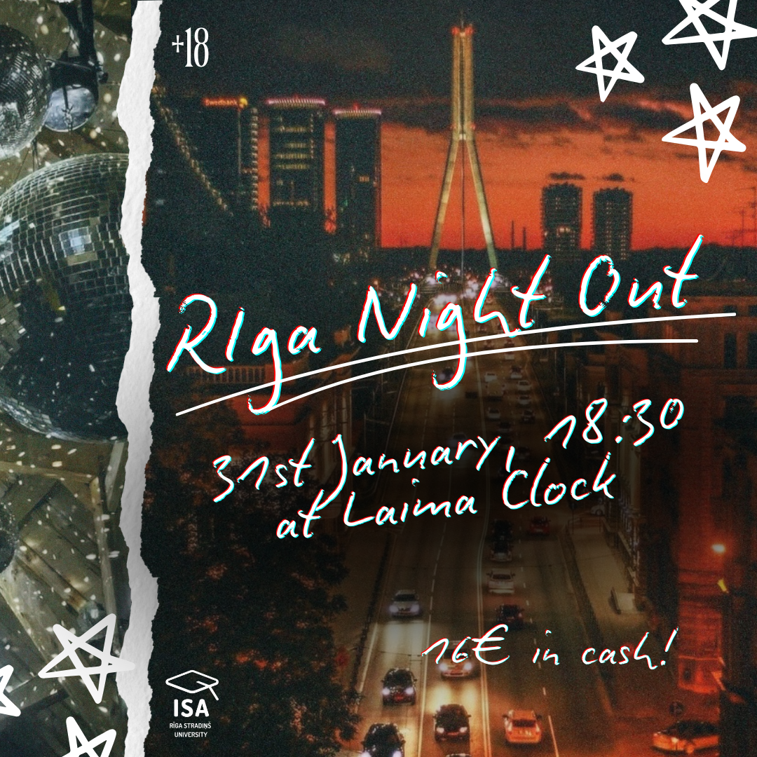 Piektdien, 31. janvārī, ikvienam būs iespēja izbaudīt Rīgas naktsdzīvi. Dalībnieki tiksies plkst. 18.30 pie leģendārā Laimas pulksteņa, un vakars būs piepildīts ar draudzīgu kopābūšanu un piedzīvojumiem, studentiem iepazīstot Rīgas dinamisko naktsdzīvi. Dalības maksa ir 16 eiro (norēķini tikai skaidrā naudā). Cenā iekļauts dzēriens katrā izklaides vietā, ko studenti apmeklēs pasākuma ietvaros.