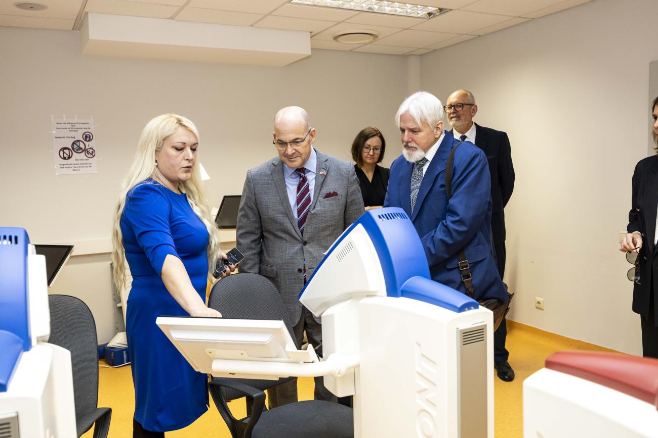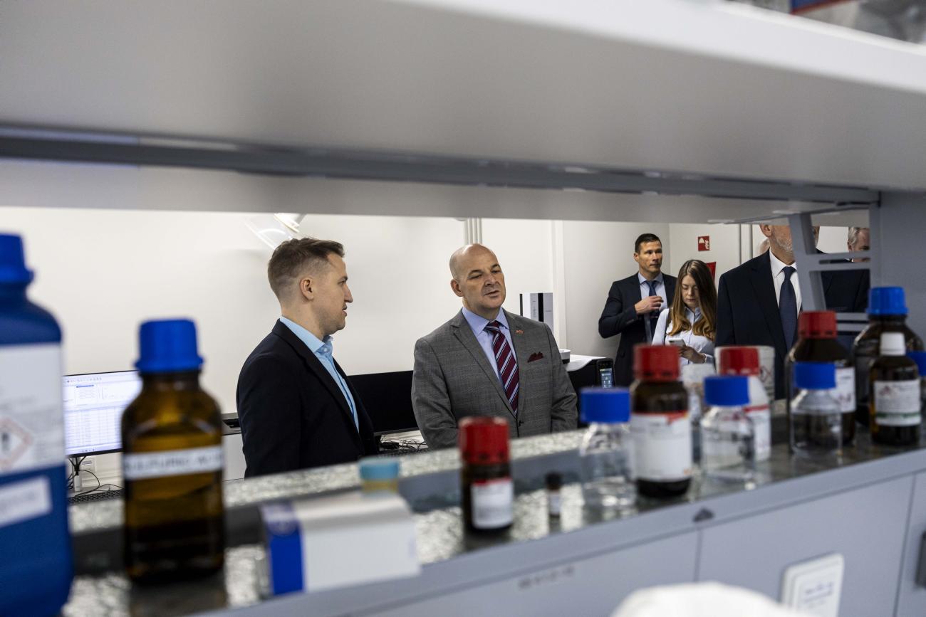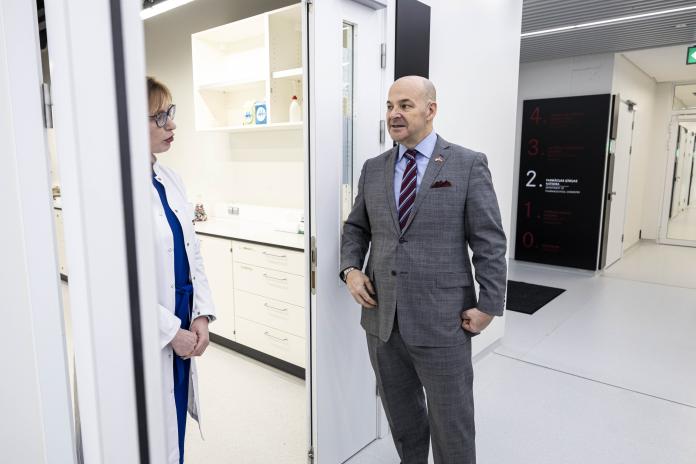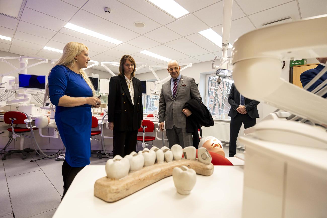 ASV vēstnieks apmeklē RSU farmācijas laboratorijas un izmēģina zobārstniecības simulācijas tehnoloģijas