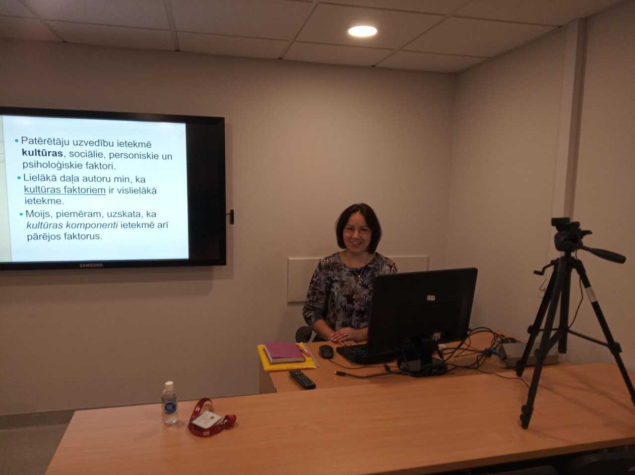 Eiropas studiju fakultātes Starptautiskā biznesa un ekonomikas katedras lektore Kristīne Blumfelde-Rutka veic lekcijas videoierakstu studiju kursā "Patērētāju uzvedība". Foto no K. Blumfeldes-Rutkas privātā arhīva