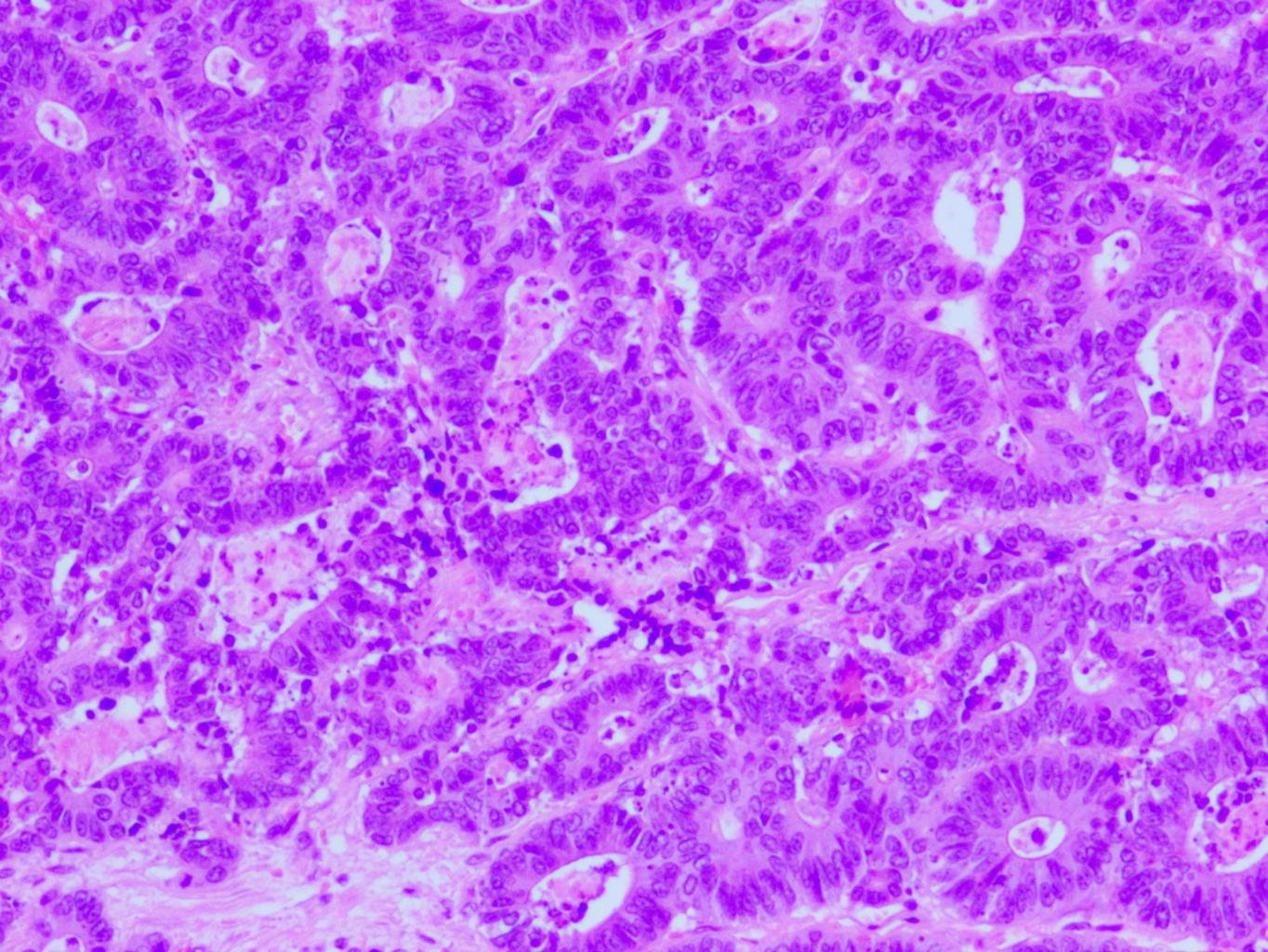Resnās zarnas adenokarcinoma hematoksilīna eozīna krāsojumā. Foto: Inese Briede
