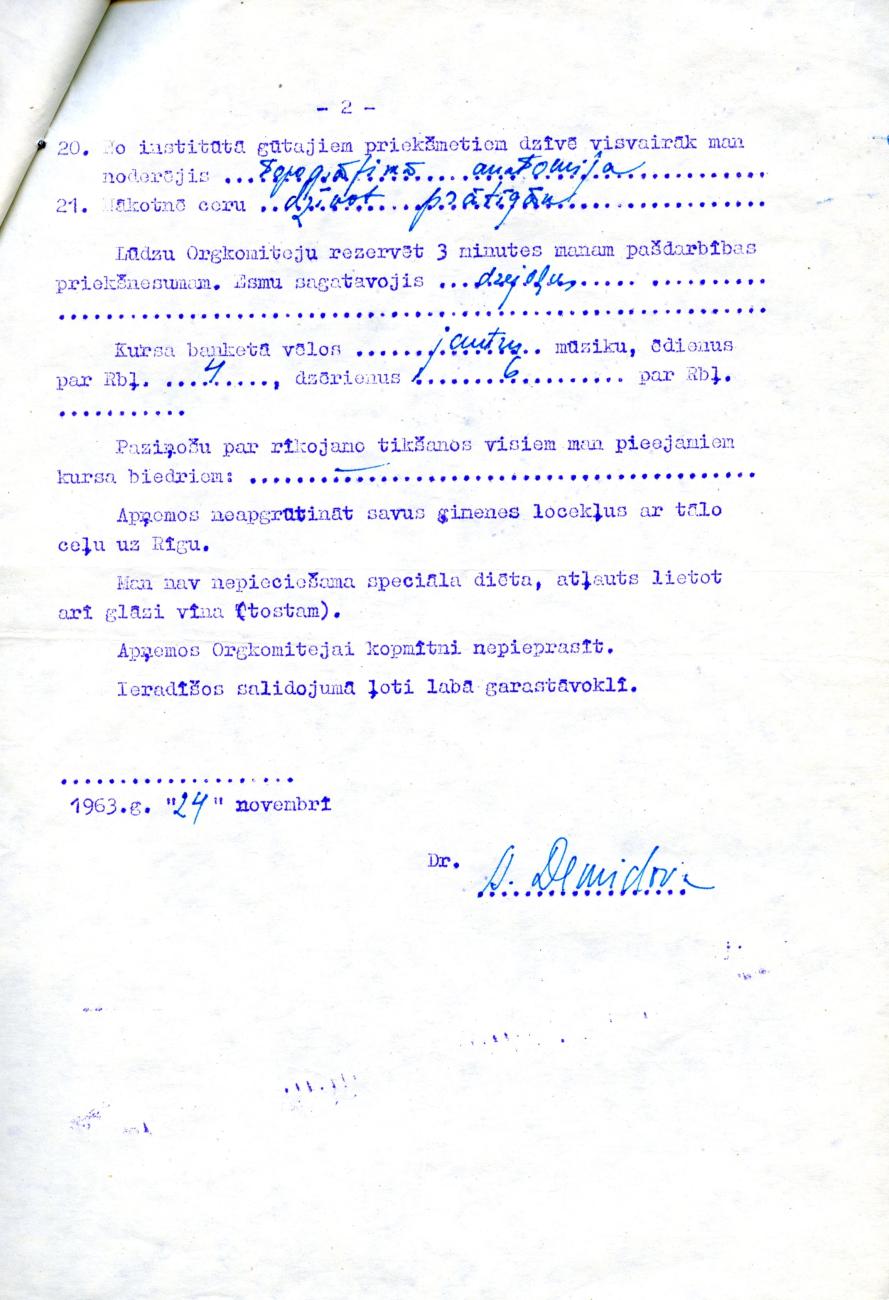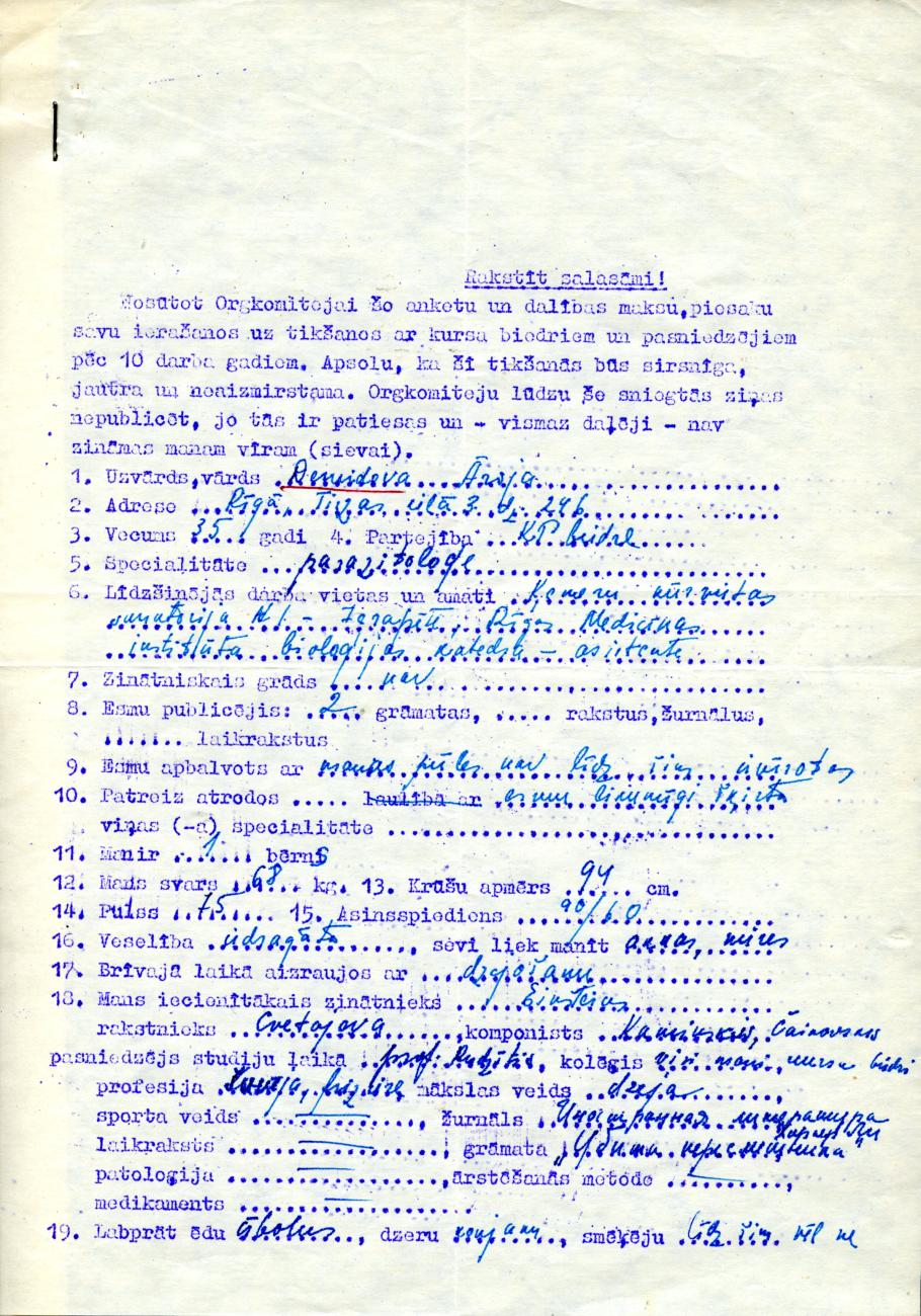 RSU muzeja krājumā glabājam interesantu priekšmetu, ko 2015. gadā ieguvām no profesora Modra Melzoba ģimenes. Tā ir anketa, ko uz absolventu salidojumu 10 gadus pēc augstskolas pabeigšanas ar asprātīgām atbildēm aizpildījusi Ārija Demidova (skat. anketu foto galerijā raksta sākumā).