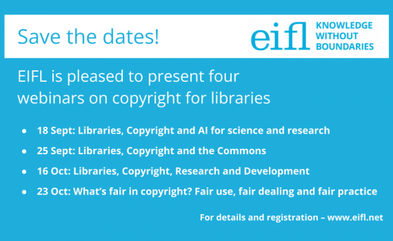 EIFL (Electronic Information for Libraries – elektroniskā informācija bibliotēkām) piedāvā četrus vebinārus par autortiesībām zinātnes, pētniecības un bibliotēkas kontekstā.