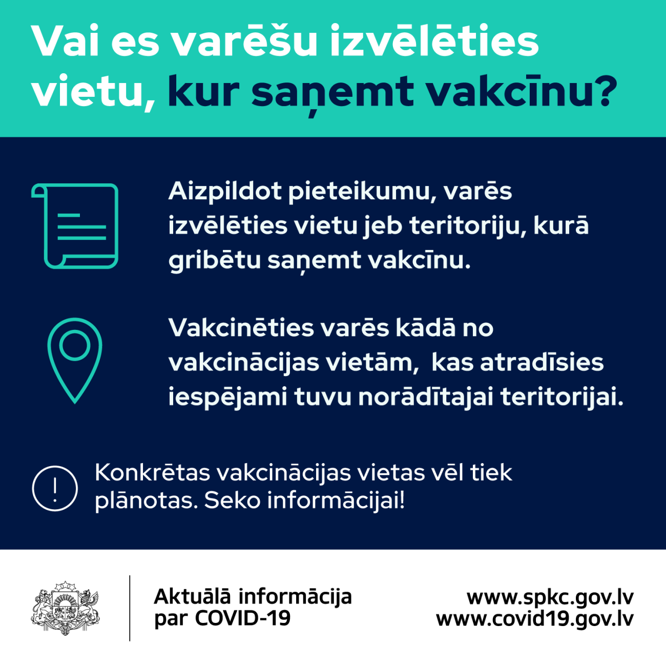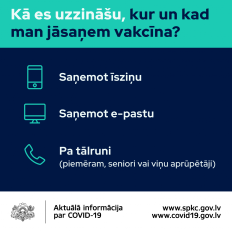 Pašlaik var pieteikties savai vakcīnai elektroniski vietnē manavakcina.lv vai zvanot 8989, kas ir bezmaksas tālruņa līnija. Šīs pieteikšanās mērķis ir efektīvi plānot vakcinācijas kabinetu noslodzi.