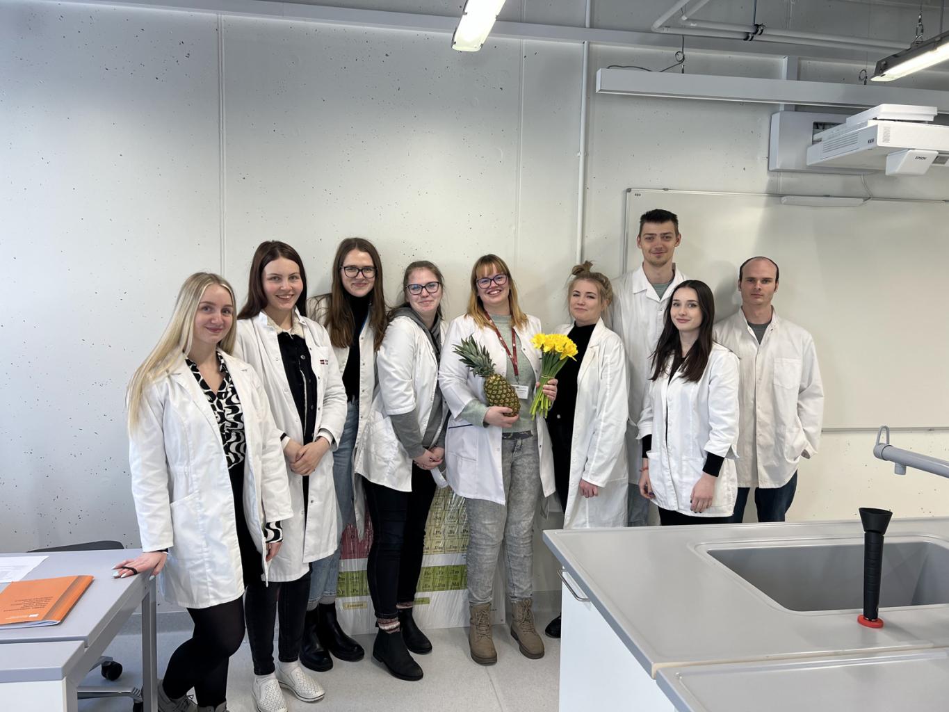 A. Semjonova (centrā) kopā ar studentiem RSU Farmācijas studiju un pētniecības centra auditorijā