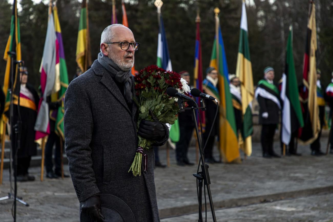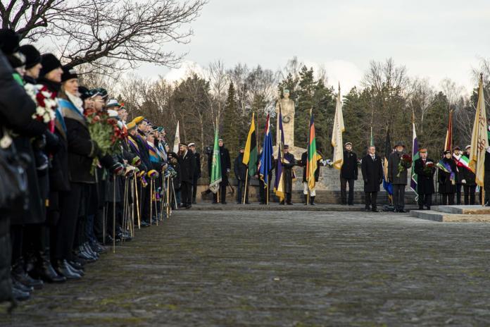 Pēc piemiņas brīža klātesošie nolika ziedus pie Mātes Latvijas tēla.