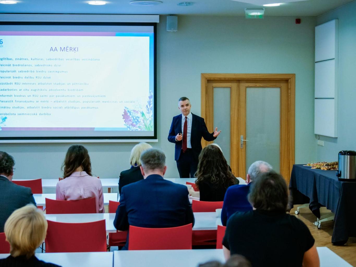 Vārdus klātesošajiem veltīja arī RSU Rektors prof. Aigars Pētersons, kur uzsvēra, ka RSU Absolventu asociācija augstskolai ir ārkārtīgi nozīmīga un ir nepieciešams stiprināt saikni starp universitāti, Absolventu asociāciju un absolventiem.