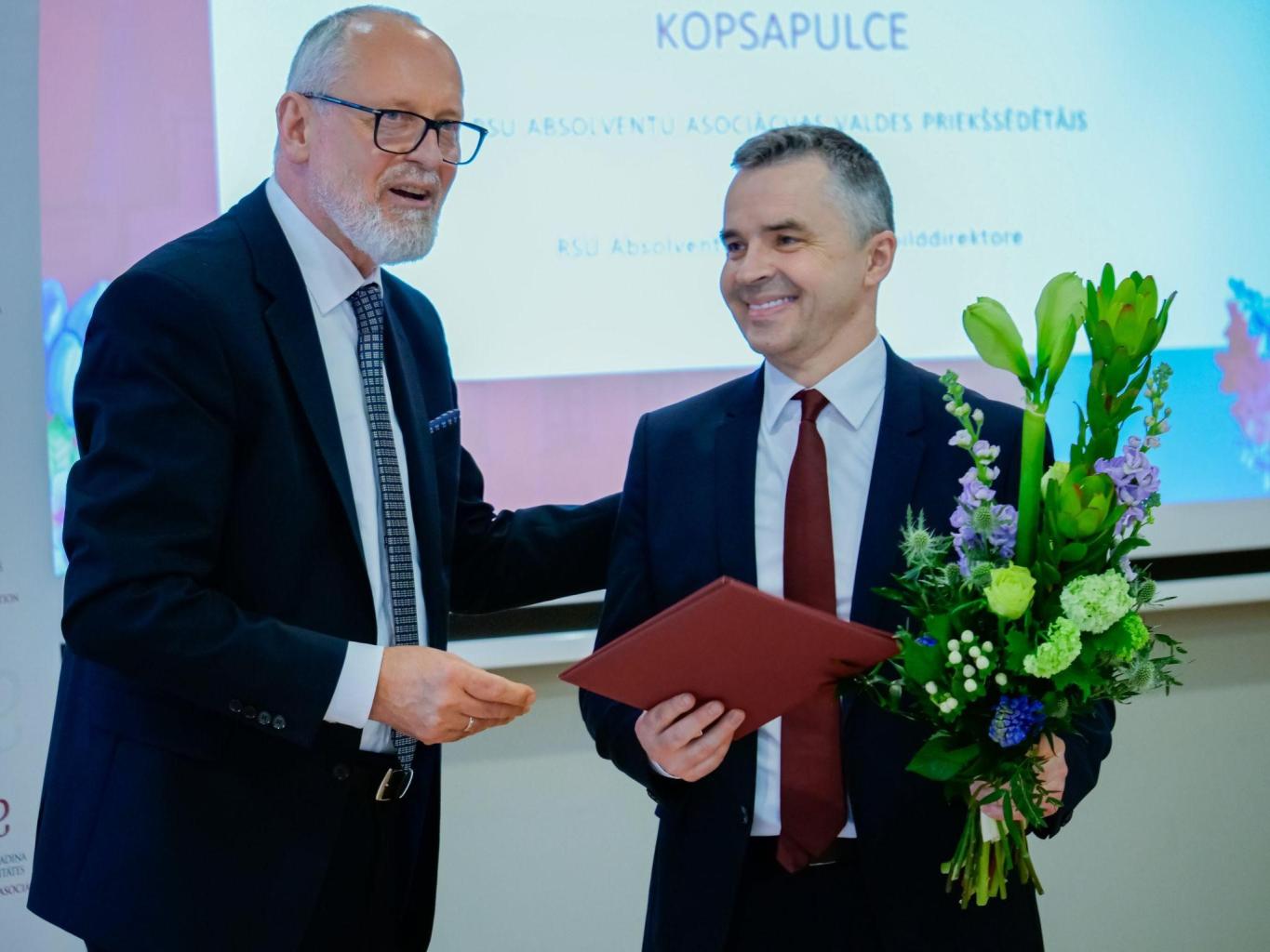 Rektors prof. Aigars Pētersons (no kreisās) un Absolventu asociācijas valdes priekšsēdētājs Dins Šmits