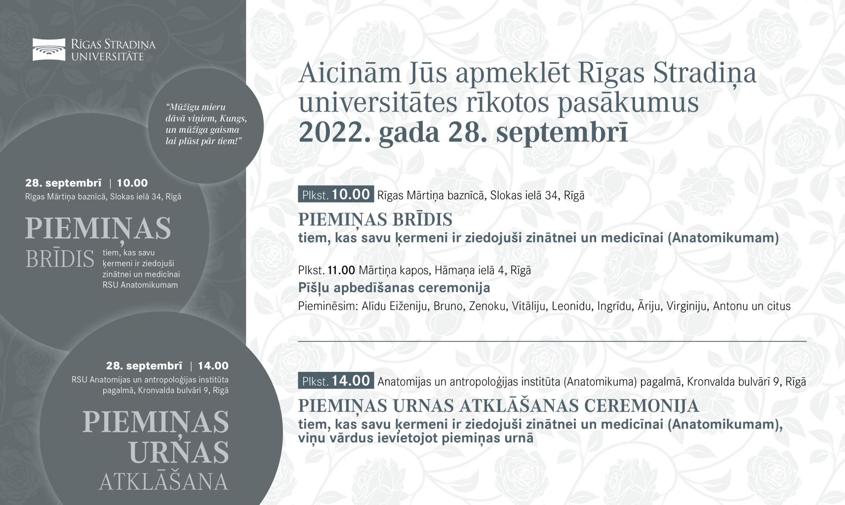 28. septembrī Rīgas Stradiņa universitāte (RSU) rīko piemiņas brīdi un apbedīšanas ceremoniju tiem cilvēkiem, kuri savus ķermeņus ir ziedojuši zinātnei un medicīnai RSU anatomikumā. Pasākumi notiks visas dienas garumā, bet dievkalpojumā Mārtiņa baznīcā, bērēs blakus esošajos Mārtiņa kapos un pēcāk pieminekļa atklāšanā anatomikuma pagalmā ir aicināts piedalīties ikviens, kurš vēlas godināt šo cilvēku augstsirdību. Kopumā zemes klēpī tiks guldītas 14 urnas ar pīšļiem.