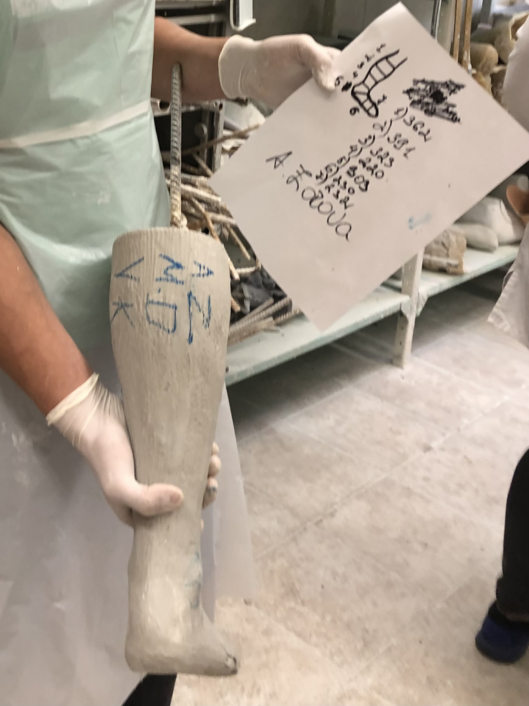 “Studiju kursā "Materiālu apstrāde" veidojām pēdas potītes ģipša atlējumu – ņēmām mērus, ģipsējām kāju, lējām ģipsi un slīpējām, lai pēc tam uz šādas formas varētu veidot pēdas un potītes ortozes,” stāsta Anželika.