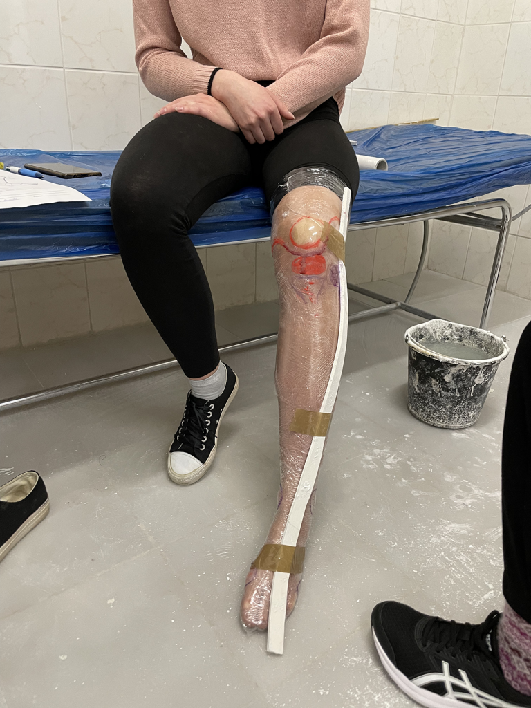 Otrajā studiju gadā studiju kursā "Ortozēšana ar cietām ortozēm" tiek ņemti mēri ortozei ar ceļa balstu.