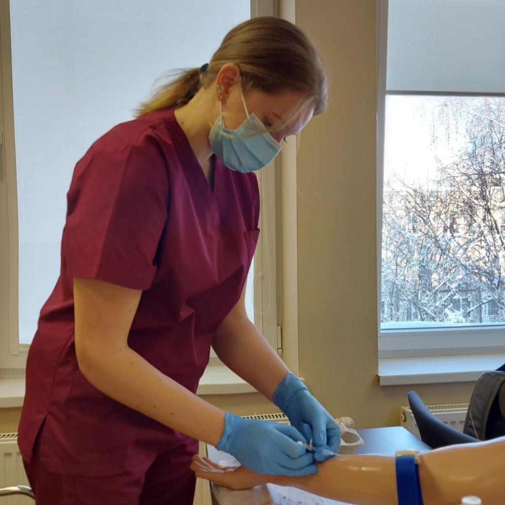 Viens no otrā studiju gada studiju kursiem tiem, kuri studē ortozēšanu un protezēšanu, ir "Klīniskās aprūpes pamati”. “Mācos likt intravenozo katetru,” skaidro studente.