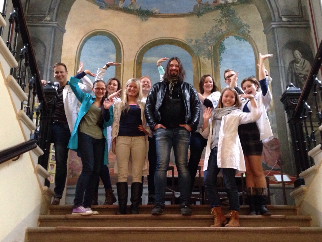 Dārta Rūse (2. rindā trešā no kreisās) 1. kursa 2. semestrī RSU anatomikumā kopā ar fizikas docētāju. 2015. gads. Foto no privātā arhīva