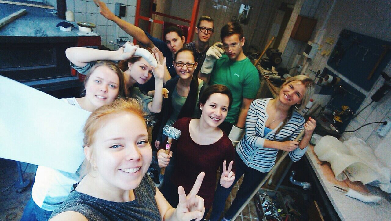 Dārta Rūse priekšplānā 2015. gada martā kopā ar kursabiedriem praktiskajā nodarbībā darbnīcā. Foto no privātā arhīva