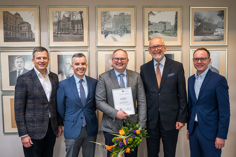 RSU vadība sveic Māri Taubi nozīmīgajā dzīves jubilejā. No kreisās: administrācijas un attīstības prorektors Toms Baumanis, prorektors akadēmiskajā darbā Dins Šmits, Māris Taube, rektors Aigars Pētersons, veselības studiju prorektors Andris Skride