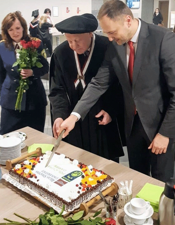 Iekšlietu ministrs Sandis Ģirģens (labajā pusē) un Juridiskās fakultātes dekāns Andrejs Vilks griež absolventu dāvināto torti