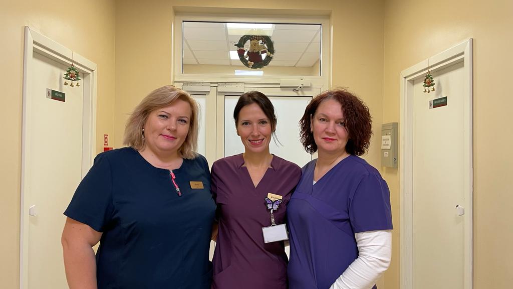 Kristīne (centrā) 2024. gada janvārī ar Piejūras slimnīcas kolēģēm – vispārējās aprūpes māsām psihiatrijā un narkoloģijā. Foto no privātā arhīva