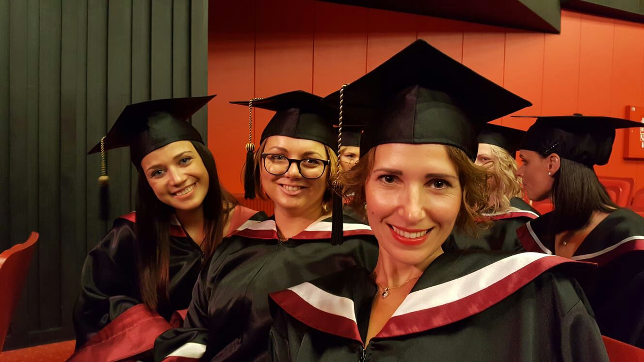 2018. gads. Kristīne (priekšplānā) izlaiduma dienā, saņemot bakalaura diplomu un garīgās aprūpes māsas kvalifikāciju. Foto no privātā arhīva