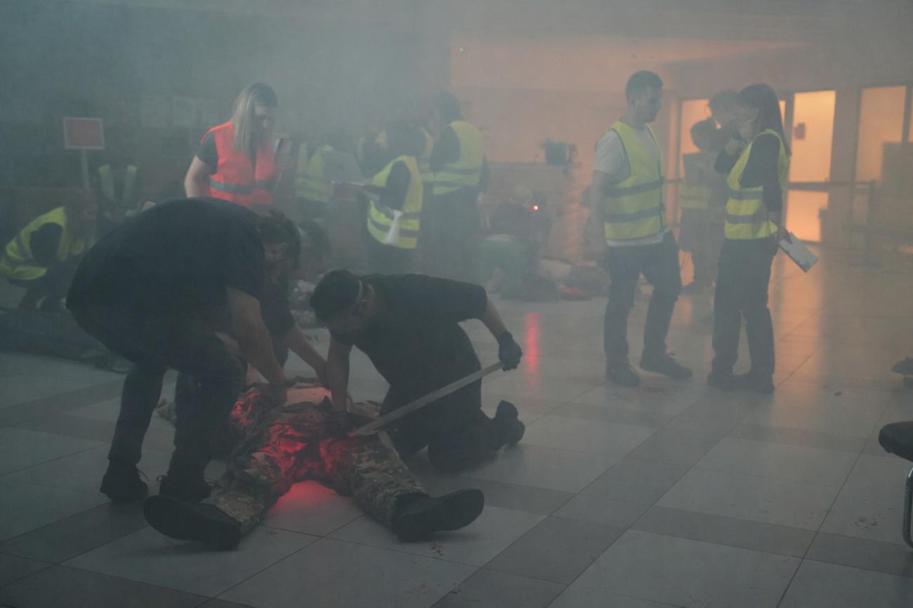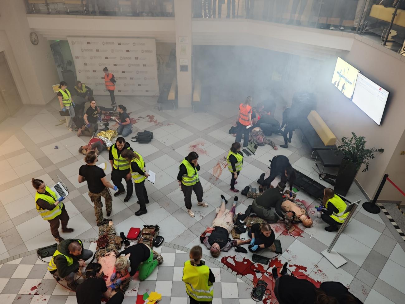 Programmas noslēgumā 24. februārī MITC tika īstenota masveida cietušo simulācija (MASCAL). Tās scenārijs tika balstīts mūsdienu bruņoto konfliktu pieredzē, tostarp Ukrainas pieredzē, kur būtiski dominē sprādzienu un šrapneļu radīti ievainojumi, kā arī bezpilota lidaparātu izraisītas traumas civilajā vidē. Lai mācību vide iespējami precīzi atspoguļotu reālas krīzes situācijas apstākļus, MITC foajē tika piepildīts ar dūmiem, izmantojot dūmu ģeneratorus un dūmu sveces, tādējādi būtiski ierobežojot redzamību. Vienlaikus tika atskaņota trauksmes sirēna, kas radīja papildu psiholoģisku spriedzi un apgrūtināja savstarpējo komunikāciju, simulējot paaugstināta apdraudējuma vidi. Simulācijas laikā rezidentiem bija jādemonstrē komandas darba prasmes, jāveic cietušo triāža, jānosaka ārstēšanas prioritātes, jāplāno un jāorganizē ierobežotu resursu sadale, kā arī jāizvērtē taktiskā situācija. Scenārijs paredzēja sešu simulētu cietušo aprūpi, kuru lomas atveidoja speciāli sagatavoti simulācijas dalībnieki, tādējādi radot pēc iespējas realitātei pietuvinātu un emocionāli intensīvu vidi. Smagu ievainojumu atveidošanai papildus tika izmantoti militārās medicīnas specifikai atbilstīgi augstas precizitātes manekeni.