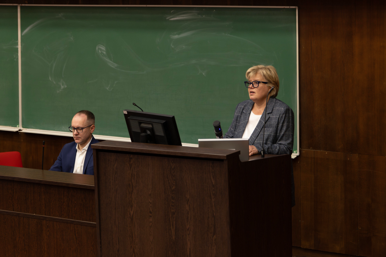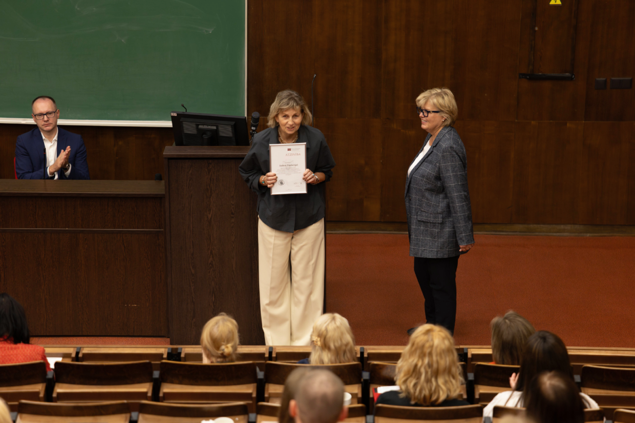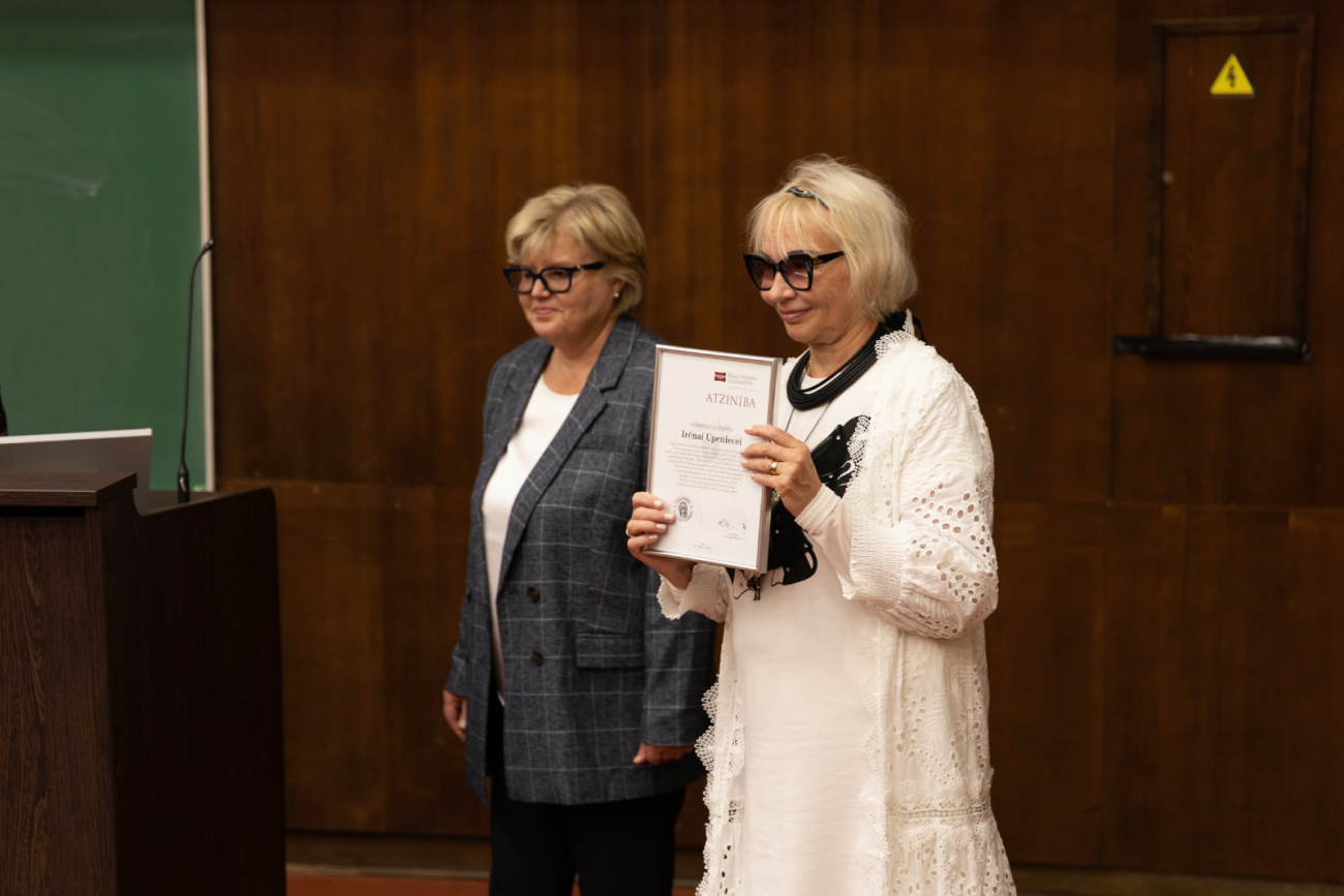 Asociētā profesore Irēna Upeniece, atzīmējot apaļu dzīves jubileju, tika īpaši sveikta par ilggadēju un nozīmīgu darbu RSU.
