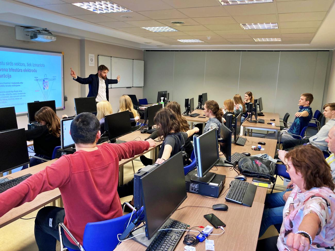 Atvērto durvju dienā aptuveni 20 skolēniem un skolotājiem no Talsu Valsts ģimnāzijas tika noturēta aizraujoša nodarbība medicīniskajā fizikā RSU Medicīnas izglītības tehnoloģiju centrā. Skolēni tvēra zināšanas gan par ārējās iedarbības elektriskās strāvas ietekmi uz cilvēka fizisko ķermeni, gan par cilvēka ķermeņa radītās strāvas ietekmi uz apkārtējo vidi.