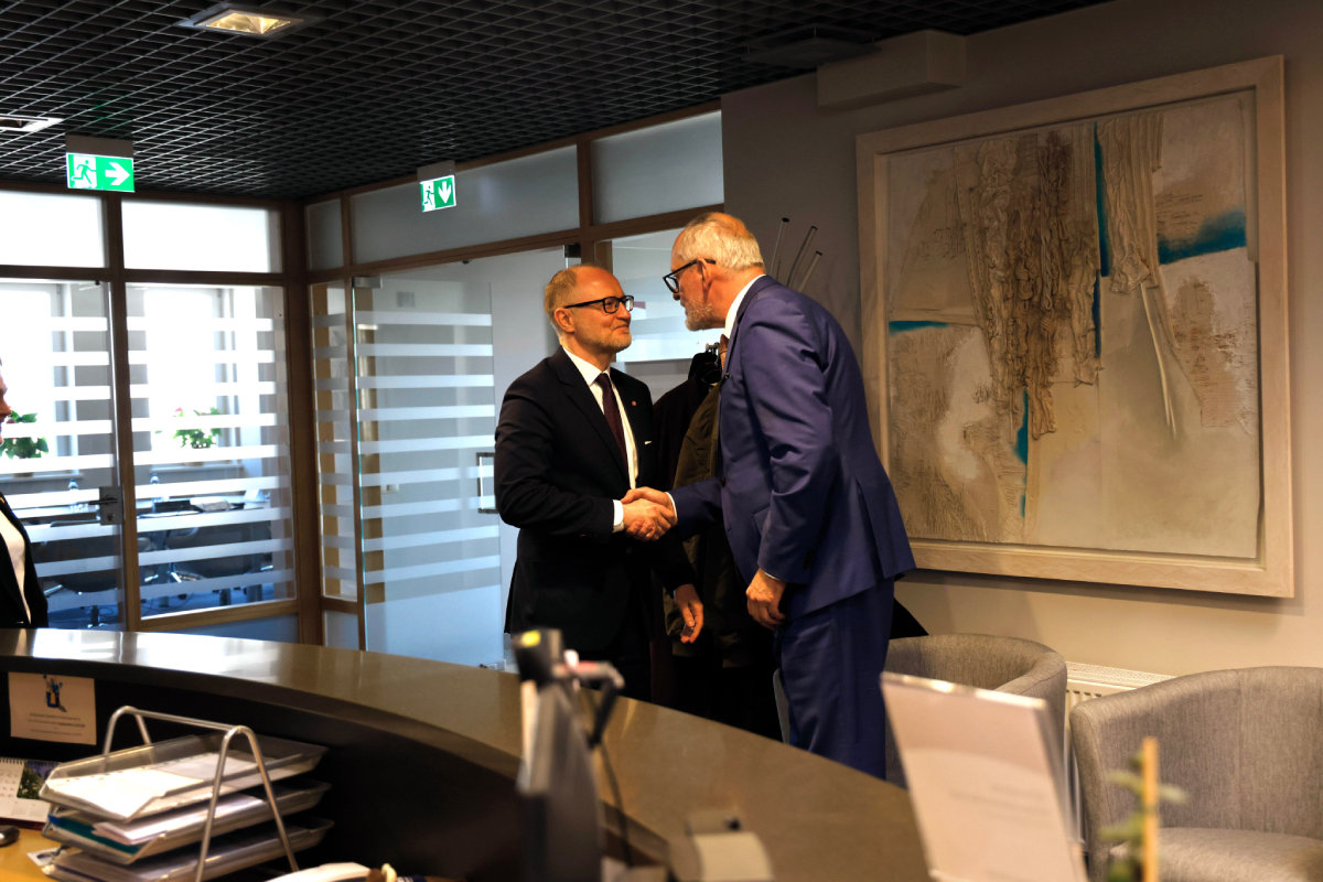 Rektors prof. Aigars Pētersons (no labās) un aizsardzības ministrs Andris Sprūds tikšanās laikā