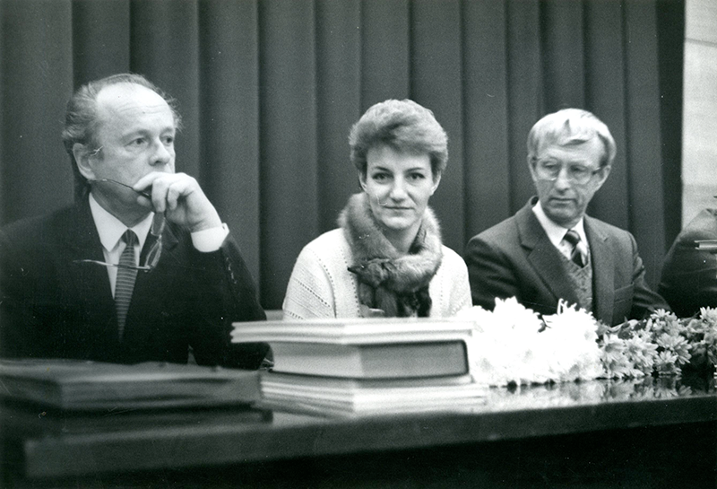 Olimpiādes Students un zinātniski tehniskais progress prezidijs. No kreisās: RMI rektors profesors Vladislavs Korzāns, docente Silvija Remberga, profesors Ivars Ebels. Republikāniskā Bērnu klīniskā slimnīca Rīgā, Vienības gatvē 45. 1985. gada novembris