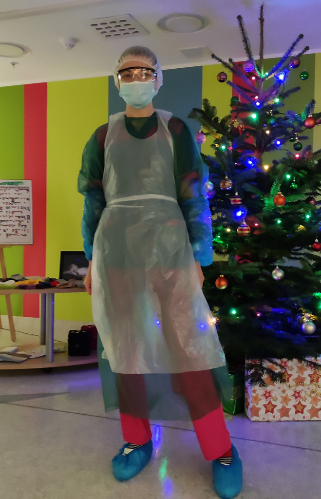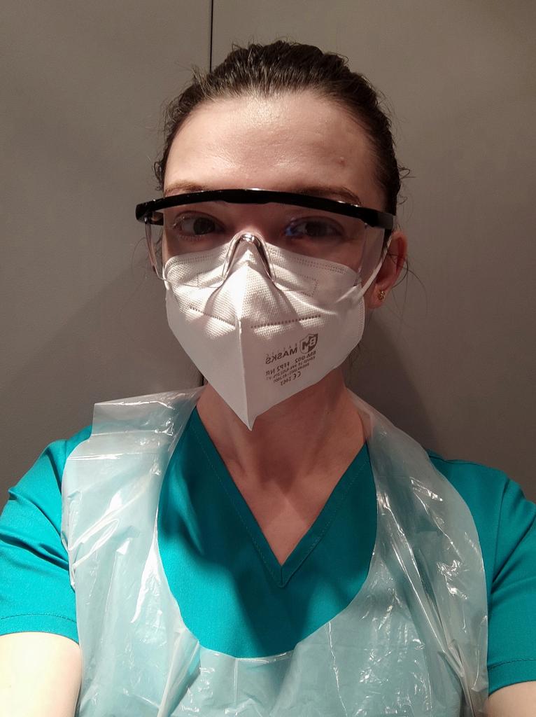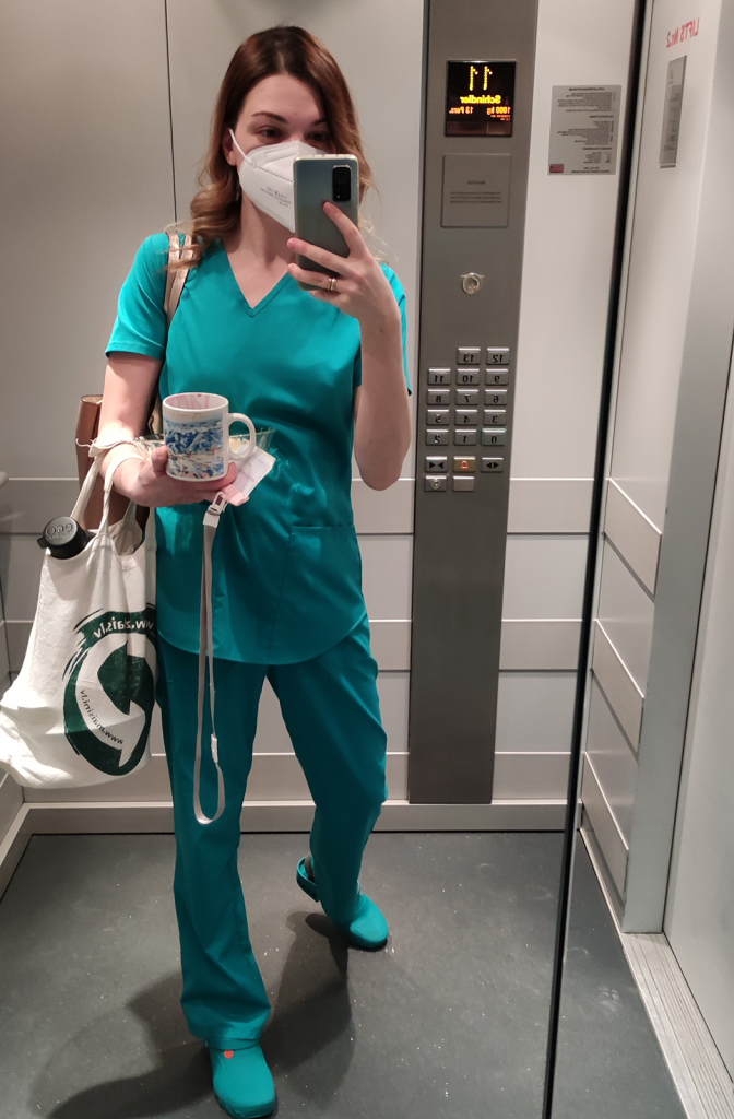 2021. gads. Laine Liepājas reģionālās slimnīcas liftā, dodoties no vienas 12 stundu maiņas uz nākamo 12 stundu naktsmaiņu citā slimnīcas nodaļā