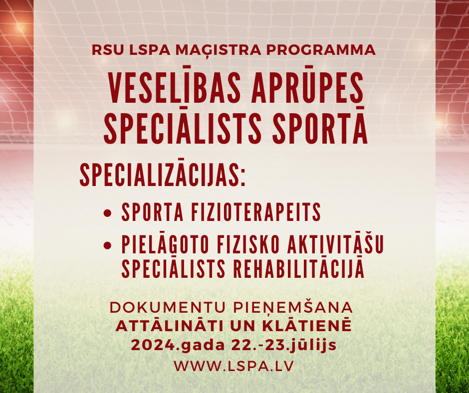 22. un 23. jūlijā RSU Latvijas Sporta pedagoģijas akadēmijā (LSPA) turpināsies studentu uzņemšana akadēmiskā maģistra programmā Veselības aprūpes speciālists sportā ar specializācijas virzieniem Sporta fizioterapeits vai Pielāgoto fizisko aktivitāšu speciālists rehabilitācijā. Programmā ir valsts apmaksātas budžeta vietas.