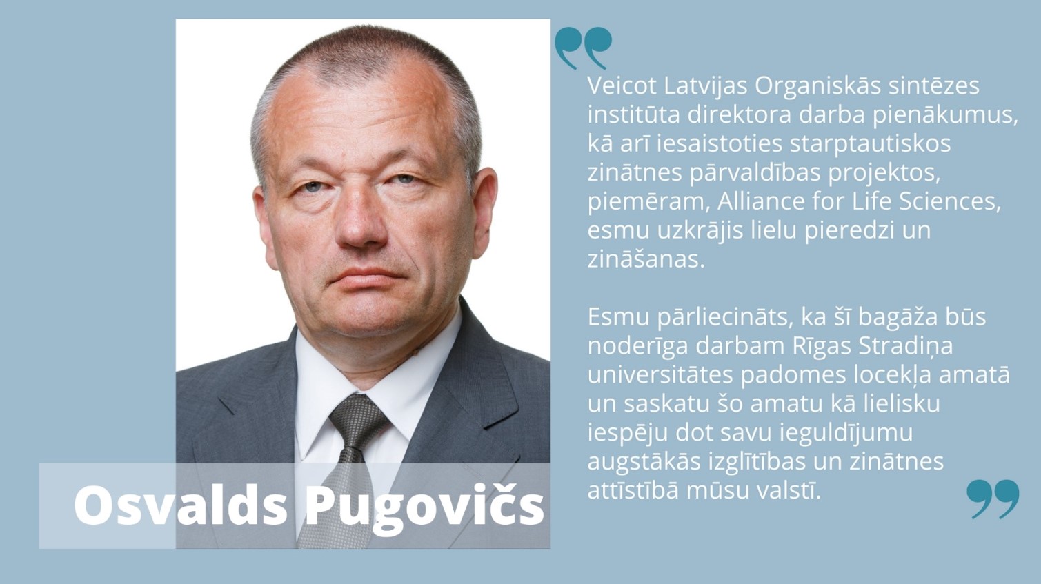 Ķīmijas doktors Osvalds Pugovičs kopš 2015. gada ir Latvijas Organiskās sintēzes institūta direktors, līdz tam ilgus gadus bijis direktora vietnieks. O. Pugovičs ir Latvijas Universitātes un Rīgas Stradiņa universitātes studiju programmu padomes loceklis, kā arī Latvijas Ķīmijas un farmācijas uzņēmēju asociācijas valdes loceklis un Valsts zinātnisko institūtu asociācijas valdes priekšsēdētājs.