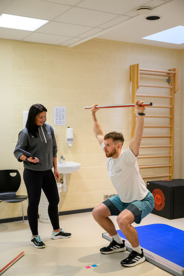 Papildus tam mēs veicam fiziskā stāvokļa novērtēšanas testu (attēlos zemāk), kas pārbauda ķermeņa kustību amplitūdu, muskuļu spēku un kustību kvalitāti, palīdzot identificēt potenciālās traumu vietas, piemēram, gūžās vai ceļos.