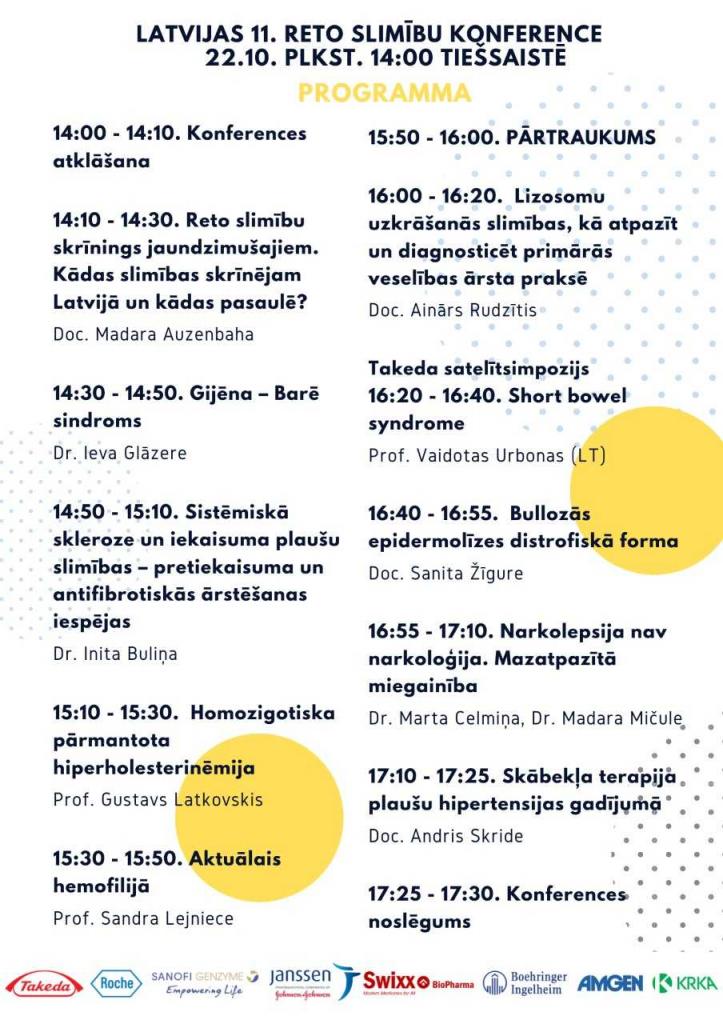 Latvijas Reto slimību speciālistu asociācija sadarbībā ar Rīgas Stradiņa universitāti (RSU) 22. oktobrī tiešsaistē, sākot no plkst. 14.00, rīkos Latvijas 11. Reto slimību konferenci. Kā katru gadu, konferencē tiks aptvertas aktualitātes reto slimību diagnostikā un ārstēšanas iespējās, un tā būs saistoša gan ģimenes ārstiem un citiem speciālistiem, gan medicīnas un veselības aprūpes studentiem.