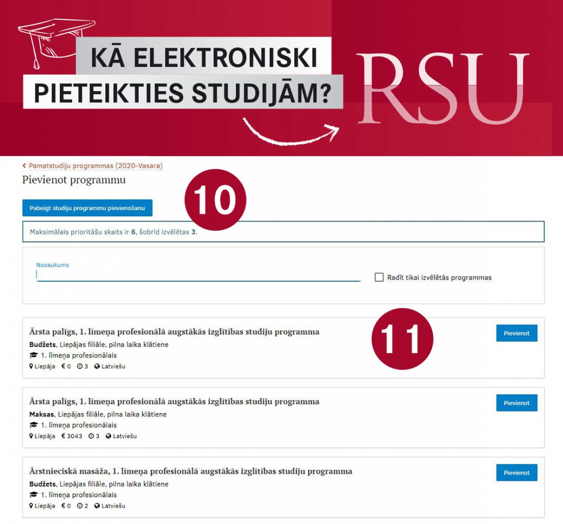 10. Izmantojot meklētāju, atlasi studiju programmas. Spied pogu Pievienot