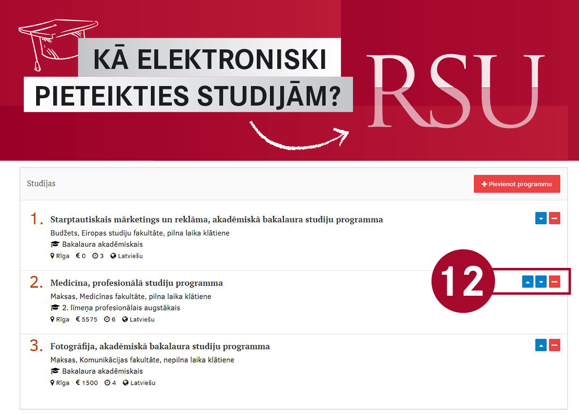 12. Ar bultiņu sakārto izvēlētās studiju programmas prioritārā secībā, pirmajā vietā liekot to, kurā visvairāk gribi studēt utt.