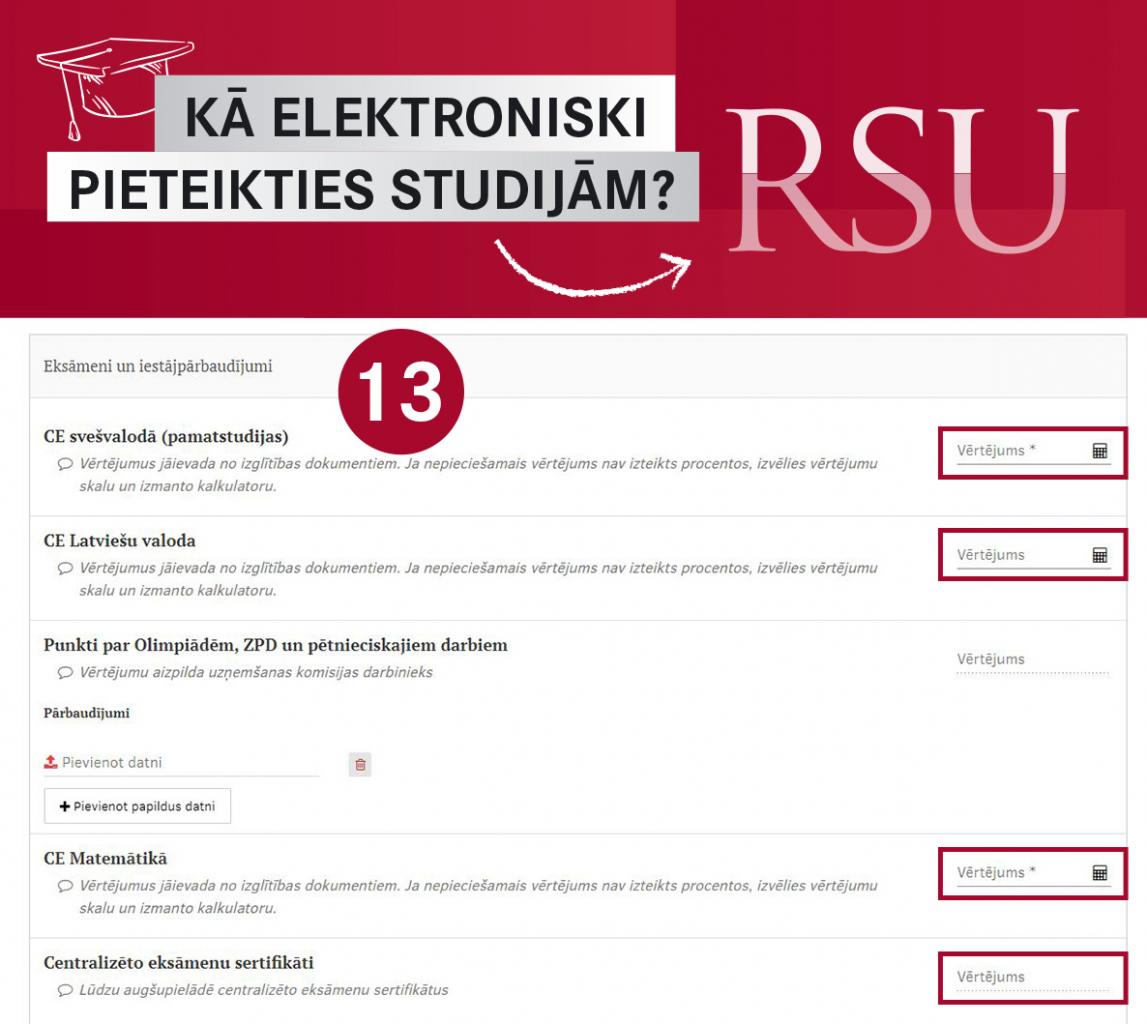 13. Ievadi centralizēto eksāmenu vērtējumu, atestāta atzīmes, pievieno ZPD, olimpiāžu vai pētniecisko darbu dokumentus, ja tādi ir