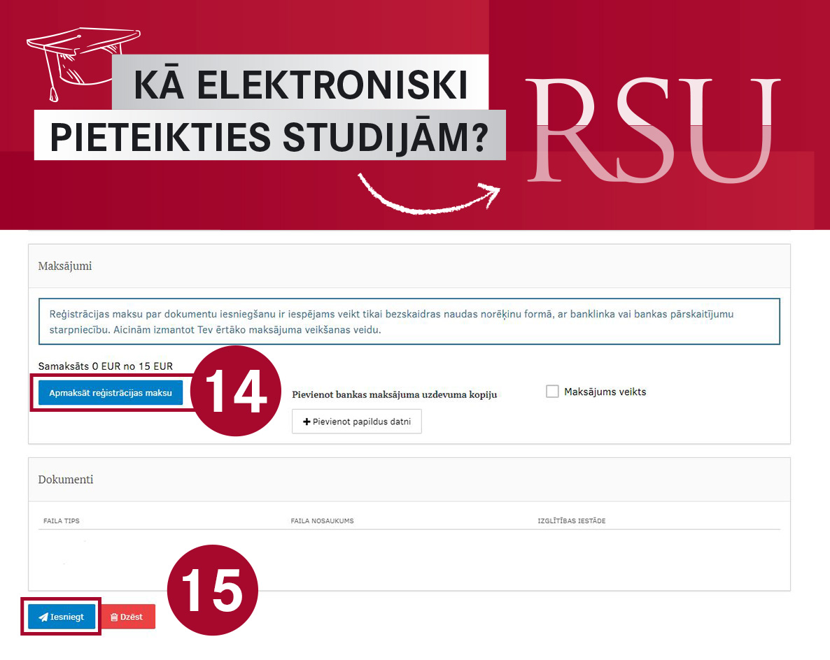 14. Samaksā reģistrācijas maksu ar banklink starpniecību vai ar pārskaitījumu internetbankā uz RSU kontu (jāpievieno bankas maksājuma uzdevuma kopija)