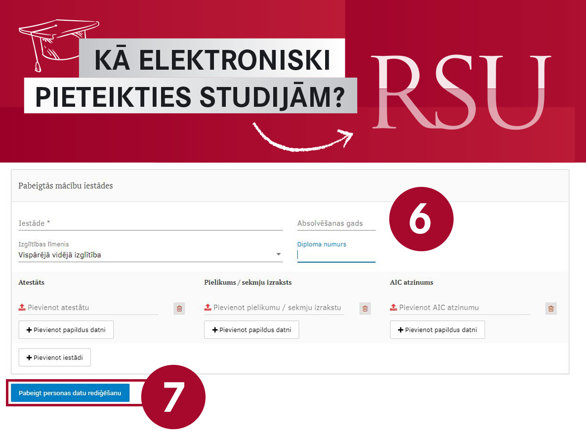 6. Norādi informāciju par izglītības iestādi, absolvēšanas gadu un diploma numuru. Pievieno nofotografētas vai ieskenētas dokumentu kopijas