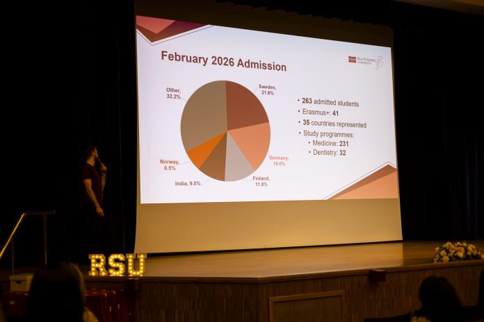 Kā jau iepriekš ziņots, 2026. gada februārī RSU sveica 262 jaunus starptautiskos studentus no 31 valsts, kuri studijas uzsākuši februāra uzņemšanā. No tiem 230 studenti izvēlējušies medicīnas studijas, bet 32 — zobārstniecību. Kopējais pretendentu skaits — 621 kandidāts no 80 valstīm — apliecina augsto interesi globālā mērogā. Pieprasījums pēc RSU medicīnas studiju programmām saglabājas augsts, apliecinot universitātes augošo starptautisko atpazīstamību. Uz vienu studiju vietu medicīnā pretendēja vidēji 2,28 kandidāti, savukārt zobārstniecībā — 3,10 kandidāti. Lielākais studentu skaits ieradies no Zviedrijas (29,4 %), Vācijas (14,9 %), Somijas (13,7 %) un Norvēģijas (8,4 %).