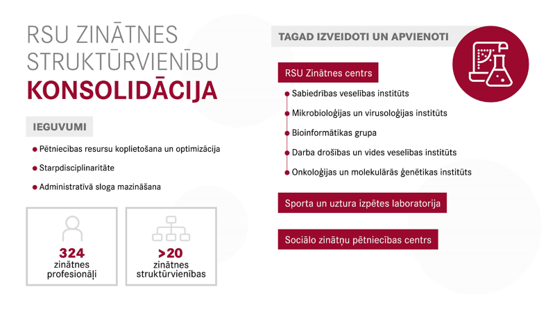 Jau kopš pērnā gada Rīgas Stradiņa universitātē (RSU) turpinās zinātnes struktūrvienību konsolidācija, lai optimizētu pētniecības procesus, veicinātu starpdisciplinaritāti, sadarbību un resursu koplietošanu, kā arī attīstītu RSU kā zinātnes universitātes izcilību. Pie šiem mērķiem ir plānots strādāt Konsolidācijas plāna ietvaros līdz konsolidācijas projekta beigām.