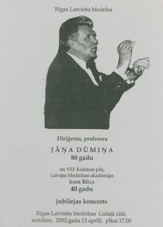 30. martā LU Lielajā aulā plkst. 19.00 ar koncertu tiks godināta izcilā diriģenta Jāņa Dūmiņa piemiņa. Tajā piedalīsies arī mūsu universitātes jauktais koris Rīga, kuru vada diriģentes Evita Taranda un Zane Zilberte.