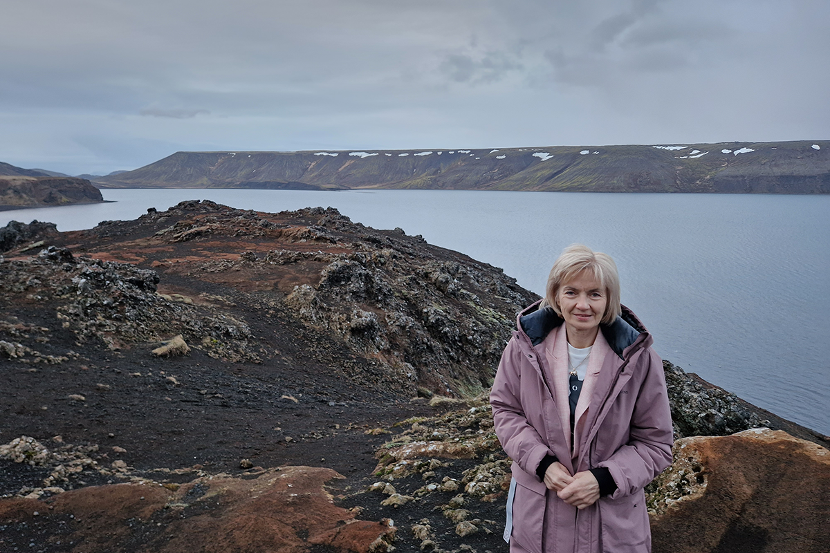Par apmeklēto galamērķi docente dalās: “Biju Islandē jau trešo reizi. Skarba un skaista zeme, kurā tā īsti saproti cilvēka un dabas savstarpējo attiecību trauslumu un dabas varenību. Zeme, kurā vējš kārtīgi sapurina un aizpūš visas drūmās domas, stāvot okeāna krastā, klajumā vai kalna virsotnē. Zeme ar kvalitatīviem ceļiem, ar tīru un garšīgu ūdeni, ar dziļiem, skaistiem ezeriem, daudzām tūrisma takām un geizeriem, ar aktīvu, pulsējošu un kūpošu zemi un ar aktīviem, uzņēmīgiem cilvēkiem, kas iemācījušies sadzīvot ar dabas kaprīzēm un veiksmīgi izmantot tās savas veselības un labizjūtas stiprināšanai. Biju Grindavīkā, kur tikai pirms dažiem mēnešiem aktīvi darbojās vulkāns. Tagad par notikušo liecina tikai sastingušas melnas lavas straumes, ceļa segums ar atšķirīgas krāsas asfaltu un vietām vēl kūpoša zeme.”