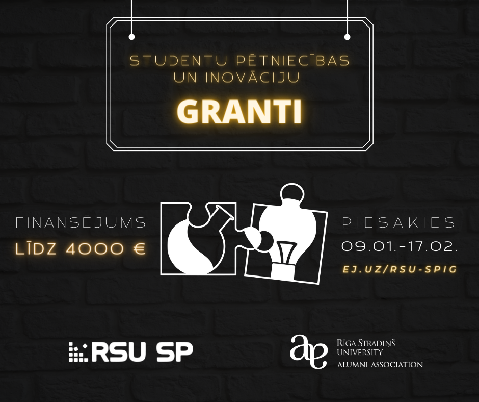 Līdz 17. februārim Rīgas Stradiņa universitātes (RSU) studenti, maģistranti un rezidenti var pieteikties pētniecības un inovāciju grantiem, kuru mērķis ir motivēt iesaistīties pētniecībā. Viss, kas tev nepieciešams, ir ideja un plāns savam pētnieciskajam darbam vai biznesa projektam! Piesakoties grantiem, iespējams iegūt līdz pat 4000 eiro lielu finansējumu sava pētījuma realizēšanai.
