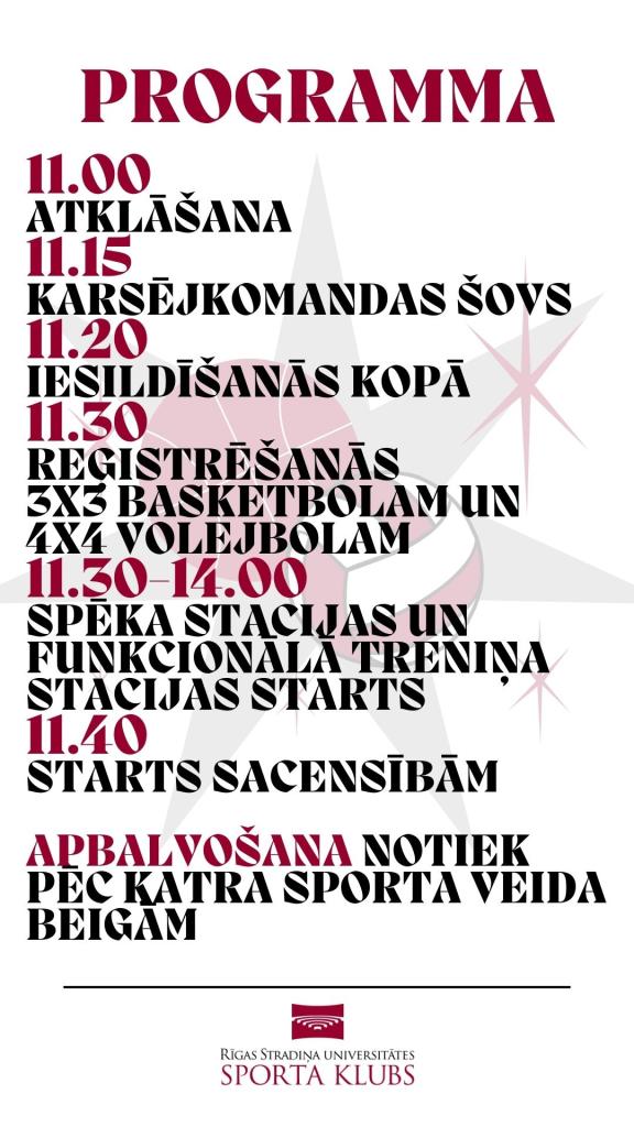 Ikgadējā pirmkursnieku Sporta diena notiks ceturtdien, 7. septembrī, plkst. 11.00 Cigoriņu ielā 3, RSU Sporta kluba bāzē. Piedalies tādos sporta veidos kā 4 x 4 volejbols un 3 x 3 basketbols, kā arī pārbaudi savas koordinācijas un spēka spējas pie mūsu Sporta kluba treneriem Mārtiņa un Dainas! Labākajiem trim būs balvas no Rīgas Stradiņa universitātes (RSU) un Sporta kluba atbalstītājiem.